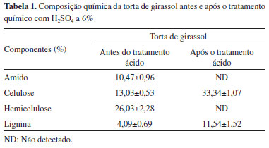 RESULTADOS E DISCUSSÃO Caracterização da torta de girassol e das frações recuperadas após a hidrólise ácida A torta de girassol analisada nesse estudo apresentou 26% de hemicelulose, 13% de celulose e 10,5% de amido (Tabela 1). Juntos, esses carboidratos somam 49,5% do peso seco da torta de girassol, o que revela seu potencial para a produção de bioetanol.