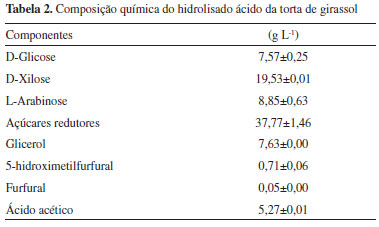 METODOLOGIA Obtenção e preparo da torta de girassol A torta de girassol foi obtida junto à empresa BIOSEP Complexo dos Lagos - Energia e Agronegócio Ltda, localizada no município de Três Pontas, MG, Brasil. A torta in natura foi submetida à secagem em estufa com circulação forçada de ar a 60 ºC por período de 48 horas. Em seguida foi cominuída em moinhos de facas, peneirada em malha de 1,0 mm, acondicionada em potes de plástico a temperatura ambiente (25±2 ºC) e reservada para uso posterior. Hidrólise da fração hemicelulósica da torta de girassol com H2SO4 diluído A hidrólise química da torta de girassol seca e cominuída foi realizada empregando solução de ácido sulfúrico (H2SO4) a 6% e razão sólido-líquido (S/L) de 1:3,2. O ensaio foi conduzido em autoclave à temperatura de 120 ºC, 1 atm, por 38 minutos. Na sequência, o hidrolisado foi filtrado a vácuo sobre papel de filtro (grau 292, 100 x 150 mm, Sartorius®) e foram recuperadas as frações insolúvel e solúvel. A fração solúvel do hidrolisado hemicelulósico foi neutralizada com Ca(OH)2. O resíduo sólido remanescente deste processo foi lavado com 100 mL de água destilada e o líquido recolhido também teve seu pH neutralizado com Ca(OH)2 e reservado. O resíduo sólido após sucessivas lavagens com água e filtração a vácuo sobre papel de filtro foi submetido à secagem em estufa com circulação de ar forçada a 65 ºC por 24 horas e reservado para posterior caracterização físico-química. A fração solúvel recuperada após a hidrólise ácida foi analisada quanto ao teor de açúcares redutores.29 L-arabinose, D-xilose, D-glicose, ácido acético, furfural, 5-hidroximetilfurfural (HMF) e glicerol também foram determinados no hidrolisado. Esta quantificação foi realizada por cromatografia líquida de alta eficiência com uso do sistema Shimadzu Prominence UFLC 20A, equipado com coluna Rezex ROA-Shodex® (300 x 7.5 mm) mantida a 60 ºC e uso de H2SO4 0,0025 mol L-1 como eluente a 0,6 mL min-1. As amostras foram injetadas de forma automatizada em volumes de 5 uL. A detecção por índice de refração foi usada para a determinação dos monossacarídeos, glicerol e ácido acético. A detecção espectrofotométrica foi usada para as determinações do furfural e HMF a 254 nm. Padrões externos foram usados para as determinações qualitativas e quantitativas. Preparo do inóculo com as linhagens fermentadoras de pentose As linhagens leveduriformes Galactomyces geotrichum UFVJM-R10 e Candida akabanensis UFVJM-R131 foram obtidas no banco de linhagens microbianas do Laboratório de Bioprocessos e Biotransformação da Universidade Federal dos Vales do Jequitinhonha e Mucuri. As linhagens, mantidas em glicerol 10% a -20 ºC, foram reativadas em meio YMPD (Yeast Malt Peptone Dextrose), contendo 0,3% de extrato de levedura, 0,3% de extrato de malte, 0,5% de peptona, 1% de glicose e 1,5% de ágar p/v. As culturas foram incubadas a 28 ºC em incubadora microbiológica por 48 horas. O inóculo foi preparado a partir de uma alçada das linhagens reativadas em 100 mL do meio descrito por Toquero e Bolado,30 formulado com 10 g L-1 de extrato de levedura, 20,0 g L-1 de peptona, 35,0 g L-1 de D-glicose, 20,0 g.L-1 de D-xilose, 0,47 g L-1 de (NH4)2SO4, 12,8 g L-1 de KH2PO4, 0,51 g L-1 de Na2HPO4 e 0,47 g L-1 de MgSO4.7H2O. As culturas cresceram em frascos cônicos de 250 mL incubados a 28 ºC sob agitação de 150 rpm por tempo suficiente para se atingir 1 unidade de densidade óptica (D.O), equivalente à leitura espectrofotométrica de suspensão celular livre de meio de cultura com valor de absorbância igual a uma unidade a 600 nm. Após o período de crescimento, o meio foi centrifugado por 15 minutos em centrífuga analítica a 4000 rpm e o sobrenadante foi descartado. As células foram lavadas 3 vezes com água destilada estéril a fim de retirar o resíduo do meio de cultura, ressuspensas finalmente em 100 mL de água estéril e, nessa forma, usadas como inóculo na proporção de 10% v/v. Fermentação alcoólica do hidrolisado hemicelulósico da torta de girassol O ensaio fermentativo foi conduzido em frascos cônicos de 50 mL contendo o hidrolisado hemicelulósico com e sem suplementação. O hidrolisado suplementado recebeu a adição do mesmo meio de cultivo usado para o preparo do inóculo, sem a presença de glicose e xilose, na proporção de 1:1. O processo fermentativo foi realizado em triplicata. Alíquotas de 1 mL foram colhidas a intervalos de 4 horas e centrifugadas a 15.000 g por 5 minutos. Os sobrenadantes foram armazenados a - 20 ºC para determinações analíticas posteriores e as células foram resuspensas a 1 mL com água destilada para determinação da D.O600nm. L-arabinose, D-xilose, D-glicose, xilitol, glicerol, etanol, ácido acético, furfural e 5-hidroximetilfurfural foram determinados por cromatografia líquida como já descrito anteriormente. O processo fermentativo foi avaliado ainda, quanto aos seguintes parâmetros: rendimento do produto em função do consumo do substrato, YP/S (getanol gaçúcar-1); produtividade volumétrica de etanol, QP (g L-1 h-1) e eficiência fermentativa, Ef (%).31 Caracterização química da torta de girassol antes e após o tratamento ácido Foram determinados os teores de fibra em detergente neutro - FDN, fibra em detergente ácido - FDA, celulose, lignina e hemicelulose.32,33 O teor de amido foi determinado de acordo com McCready et al.34 Todas as análises foram realizadas em triplicata. Análise estatística Para a comparação de médias foi utilizado o Teste de Tukey com nível de significância (p) igual a 0,05. As análises foram conduzidas utilizando o software ASSISTAT Versão 7.7.
