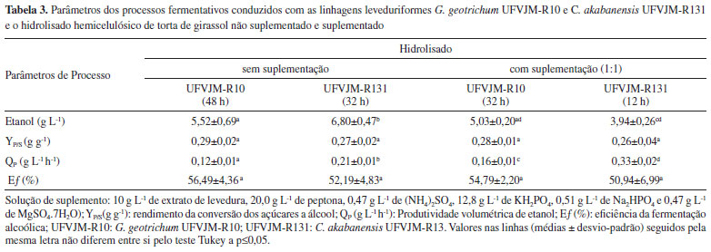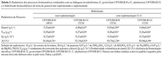 Os resultados referentes à produção de etanol e os parâmetros do processo fermentativo estão apresentados na Tabela 3.