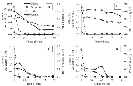 Figura 1. Perfil do consumo do glicerol, ácido acético, furfural e 5-hidroximetilfurfural (HMF) pelas leveduras G. geotrichum UFVJM-R10 (A e C) e C. akabanensis UFVJM-R131 (B e D) nos sistemas fermentativos com o hidrolisado hemicelulósico de torta de girassol não suplementado (A e B) e suplementado (C e D)