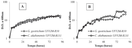 Figura 2. Perfil do crescimento celular baseado na leitura direta da densidade óptica (D.O600nm) das linhagens Galactomyces geotrichum UFVJM-R10 e Candida akabanensis UFVJM-R131 durante a fermentação do hidrolisado hemicelulósico da torta de girassol não suplementado (A) e suplementado (B)