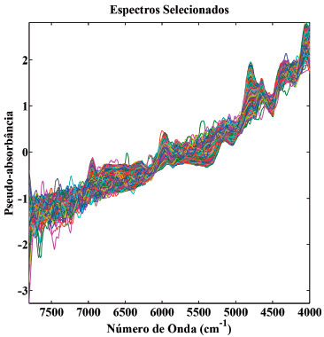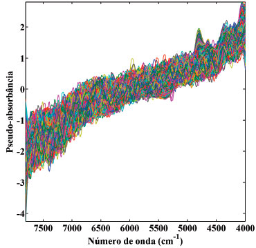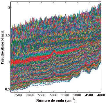 ![]() Figura 2. Espectros NIR sobrepostos em pseudo-absorbância para os dados brutos da amostra do pellet