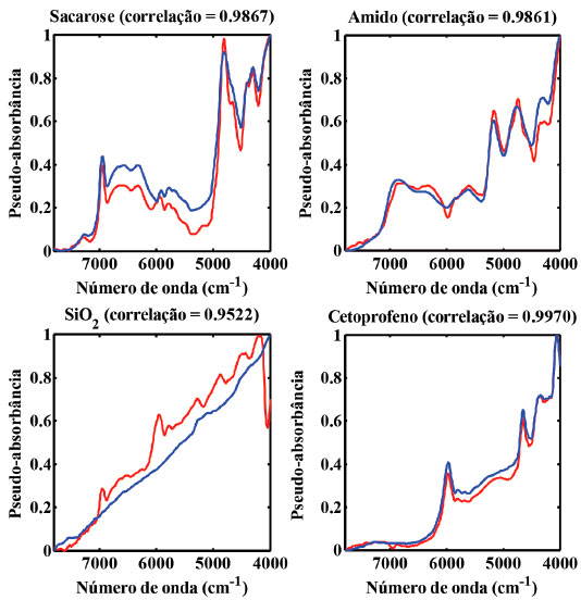 ![]() Figura 6. Comparaçao dos espectros das substâncias puras obtidos experimentalmente (azul) e os espectros recuperados pelo modelo MCR (em vermelho), além dos valores dos coeficientes de correlaçao (r2) para cada um dos componentes