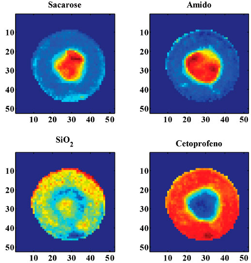 >>[SIZE.k,~] = size(DADOS(1).estimativa); >>for i=1:SIZE.k; >>subplot(1,ceil(SIZE.k),i);imagesc(reshape(MCR(1).novo_copt(:,i),SIZE.nX,SIZE.nY,1)); >>axis square >>h = title(DADOS(i+1).nomes); >>set(h,'Color','black', 'FontSize',12.5, 'FontWeight','bold') >>set(gca,'FontWeight','bold','FontSize',12) >>end >>clear h k i A avaliaçao das imagens geradas para a distribuiçao das espécies recuperadas pelo modelo deixa evidente que existem regioes bastante distintas no pellet. Na área central da amostra, há um núcleo inerte contendo sacarose e amido. O uso de um pellet inerte como partida para a deposiçao dos compostos de interesse é uma prática usual na indústria farmacêutica. 41,55,56 Imediatamente após esse núcleo inerte, há uma camada composta basicamente pelo API cetoprofeno, o que está indicado na imagem como uma regiao com coloraçao vermelha intensa. Por fim, a última espécie estudada é o dióxido de silício, que aparentemente está distribuído mais externamente na amostra, talvez como uma camada de revestimento ou proteçao. Porém, como as condiçoes de obtençao de sinal instrumental para esse composto nao é tao ideal quanto para os demais, há de se ter certo cuidado com os resultados para esse componente. Essas informaçoes nao poderiam ser obtidas em análises por NIR de forma convencional, em que apenas as informaçoes químicas estariam disponíveis, mas nao sua distribuiçao espacial. Técnicas como cromatografia líquida poderiam identificar e quantificar esses compostos, mas de forma global na amostra. Isso indica o quao útil o emprego da técnica de NIR-CI pode ser aos pesquisadores para casos semelhantes.