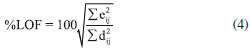 Uma vez estimadas as matrizes C e S nas etapas indicadas pelas Equaçoes 2 e 3, seu produto pode ser calculado (CST) e uma nova matriz, D*, é reconstruída a cada iteraçao. Essas etapas sao repetidas até que algum critério de convergência estabelecido previamente seja alcançado, como um número máximo de iteraçoes a ser realizado ou caso a variaçao entre o resultado da iteraçao atual e aquele da iteraçao anterior seja menor que um valor pré-estabelecido. 37,38 É importante ressaltar que, ainda que a convergência seja alcançada nessa etapa iterativa, a soluçao obtida nao é necessariamente a melhor resposta para o conjunto de dados estudado, pois há sempre o risco de se alcançar um mínimo local apesar das restriçoes pré-definidas. Dessa comparaçao da matriz de dados originais D com essa nova matriz D* podem ser calculados dois importantes parâmetros, que fornecem informaçoes sobre a qualidade do modelo construído: a porcentagem de falta de ajuste (Lack of Fit, %LOF) e a porcentagem de variância explicada (R2). O primeiro desses parâmetros é calculado conforme descrito na Equaçao 4 e compara cada termo da nova matriz com o termo correspondente da matriz original. Como o desejado é que essas matrizes sejam as mais semelhantes, os valores dos erros (e) devem ser pequenos e o valor de %LOF deverá estar mais próximo a zero. 37,38