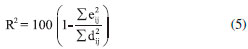 O segundo parâmetro segue o mesmo raciocínio, comparando as duas matrizes, mas dessa vez descrevendo o quanto da informaçao original está sendo modelada pelo MCR, ou seja, o quanto da matriz original D está contida na nova matriz D*. A forma de calcular a porcentagem da variância explicada é descrita na Equaçao 5 e o ideal é que 100% da informaçao original seja expressa pelo modelo, sendo portanto desejado um valor para R2 próximo a esse. 37,38