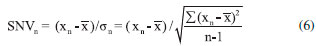 Com a intençao de difundir e popularizar o uso do MCR como ferramenta analítica, algumas boas iniciativas foram desenvolvidas, como por Jaumot et al. ,35 em 2005. Os autores disponibilizaram gratuitamente uma interface gráfica para ambiente MATLAB® que permite, de forma intuitiva, a escolha do número de componentes, da estimativa inicial e também permite a aplicaçao de restriçoes. Isso facilita o uso principalmente para usuários menos familiarizados com o software. Essa ferramenta foi sendo aperfeiçoada e hoje conta com uma atualizaçao, que oferece opçoes adicionais de restriçoes, como a restriçao de correlaçao e a inclusao de modelos pré-definidos (hard-modeling), além de formas mais eficientes de apresentaçao dos resultados. 39 Em 2014, Março et al. 37 publicaram uma completa revisao, em língua portuguesa, descrevendo os aspectos teóricos e os avanços do método até entao. Sao discutidos pontos como o uso de estimativas iniciais, a otimizaçao pelo ALS e o uso de restriçoes para minimizar o efeito de ambiguidade rotacional e sua leitura é recomendada para aqueles que desejarem se aprofundar no tema. Pelo exposto, observa-se que o método de MCR tem grande utilidade na previsao da concentraçao e na distribuiçao dos constituintes das amostras farmacêuticas, sendo viável seu uso em processos industriais e no desenvolvimento de medicamentos. 25,40-45 O que se propoe entao, nesse tutorial, é apresentar uma opçao para o ensino desses tópicos em disciplinas experimentais de Química Analítica, baseando-se em experiências bem-sucedidas no Instituto de Química da Unicamp. Pré-tratamento Uma realidade encontrada pelo analista é que, junto da informaçao desejada, informaçoes nao relevantes sao obtidas no momento da análise e uma boa parte dela pode ser removida em uma etapa criteriosa de pré-tratamento dos dados. Um exemplo sao variaçoes presentes em espectros obtidos por reflectância difusa em NIR, que ocorrem basicamente por fenômenos de espalhamento aditivo e multiplicativo da radiaçao na superfície das partículas. O fator mais importante para o espalhamento da radiaçao está relacionado com o tamanho das partículas do material, sendo um fenômeno essencialmente físico e que normalmente se manifesta como uma variaçao na inclinaçao do espectro. Dentre as possibilidades para a correçao desses efeitos,46 uma delas é o uso da Padronizaçao Normal de Sinal (Standard Normal Variate, SNV), que corresponde a autoescalar cada linha da matriz original dos dados. 47 Sao calculados o espectro médio (-x) e o desvio padrao (σn) das amostras, onde n é o número de amostras e, por consequência, de espectros (Equaçao 6).