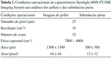 PARTE EXPERIMENTAL Materiais e reagentes Para o estudo, foi utilizado um pellet comercial cujo princípio ativo é o cetoprofeno, um fármaco da classe dos anti-inflamatórios nao-esteroides e que apresenta açao anti-inflamatória e analgésica. 49 Esses pellets sao constituídos de um núcleo inerte e de camadas que recobrem a regiao central, possuindo diâmetro aproximado de 900 µm. Para a análise, as amostras foram cortadas ao meio com auxílio de lâmina de barbear em uma lupa (Carl Zeiss, modelo Stemi DV4, 8 a 32x de magnificaçao). Após isso, foram afixadas em uma placa de vidro com fita dupla face transparente, para que fossem obtidos os dados que irao corresponder às imagens químicas dos componentes da amostra. Para a comparaçao dos sinais instrumentais originais com os recuperados pelo modelo MCR, foram usados os reagentes de grau analítico cetoprofeno (Sigma-Aldrich), amido (Synth), sacarose (Synth) e dióxido de silício (Sigma-Aldrich), que foram acondicionados em um porta-amostras de alumínio, cuja cavidade foi completada com o pó do composto químico. Para minimizar o espalhamento da radiaçao, a superfície foi nivelada para que ficasse o mais uniforme possível. Condiçoes operacionais A aquisiçao dos espectros das amostras de pellets e das substâncias puras foi realizada no espectrômetro Spectrum 100 N FT-NIR, acoplado a um sistema de imagem Spotlight 400 N, ambos da Perkin-Elmer. As condiçoes operacionais utilizadas sao informadas na Tabela 1.