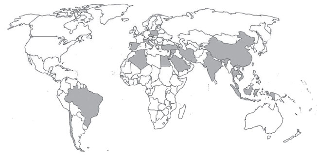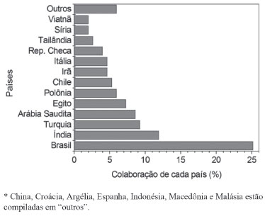 Embora nesta revisao tenham sido encontradas publicaçoes oriundas de vinte países, alguns destes representam parcelas expressivas na contribuiçao deste levantamento bibliográfico. Brasil, India e Turquia ocupam os primeiros lugares em número de publicaçoes com HMDE, seguidos pela Arábia Saudita e Egito com 8,6 e 7,3% de participaçao, respectivamente. A Figura 2 apresenta a colaboraçao de cada país para com estudos realizados com HMDE nos últimos dez anos avaliados no presente trabalho.