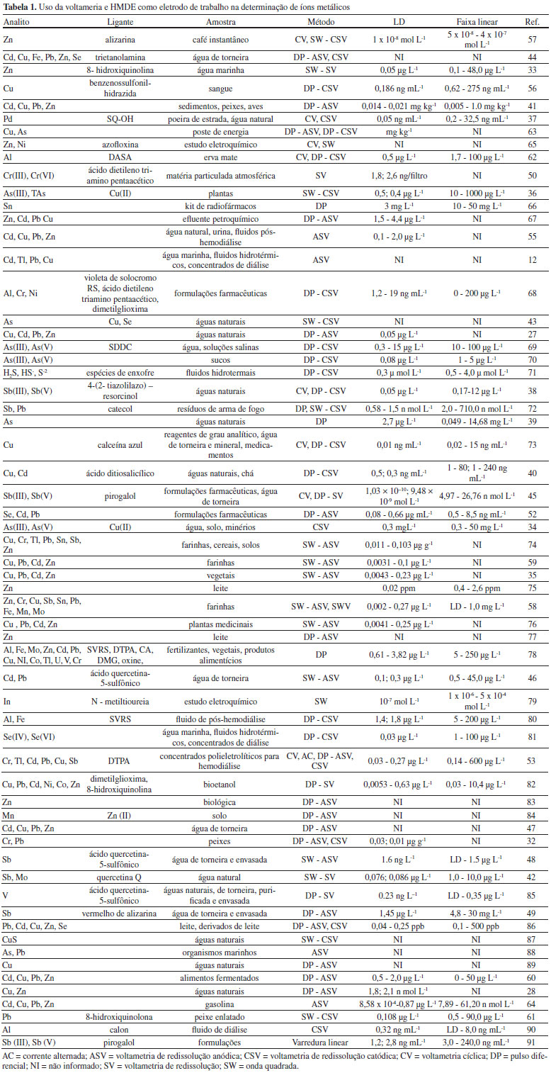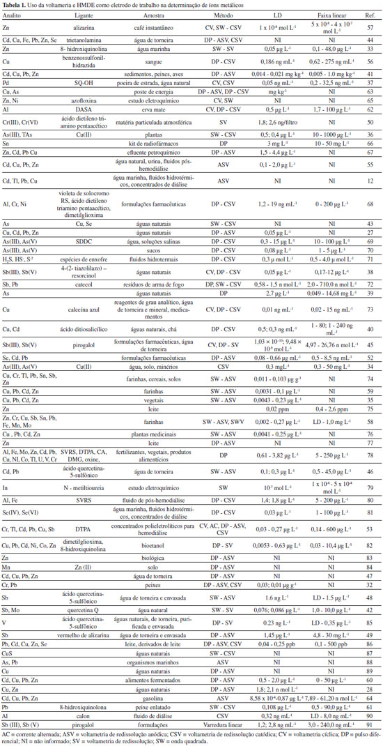 | A versatilidade do eletrodo de gota pendente de mercúrio em química analítica - uma revisão sobre recentes aplicações The versatility of the hanging mercury drop electrode in analytical chemistry - a review about recent applications |