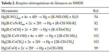 Como pode ser visto na Tabela 1, diferentes amostras podem ser analisadas empregando voltametria com o HMDE como eletrodo de trabalho na determinaçao de íons metálicos. Alguns trabalhos empregaram um agente complexante ou ligante para possibilitar ou otimizar a determinaçao por voltametria. Limites de detecçao na ordem de partes por bilhao podem ser considerados comparáveis aos obtidos por técnicas espectrométricas. A faixa linear de trabalho alcançada é variável com o método voltamétrico empregado. Os métodos nos quais sao empregados tempos de pré-concentraçao do analito (métodos de redissoluçao) sao frequentemente empregados especialmente para analitos presentes em baixas concentraçoes, possibilitando minimizar os limites de detecçao. Determinaçao de compostos orgânicos usando HMDE Determinaçoes quantitativas de compostos orgânicos em matrizes complexas empregando métodos voltamétricos que usam como eletrodo de trabalho o HMDE sao amplamente realizadas para amostras ambientas, farmacêuticas, etc. As vantagens já sao conhecidas como adequada frequência analítica, medidas de baixo custo, etc. Além disso, outro aspecto vantajoso é a possibilidade de realizar as medidas voltamétricas de modo direto, sem a necessidade de procedimentos prévios de separaçao e extraçao do analito. Contudo, é conhecido que a seletividade da voltametria para compostos orgânicos pode ser mais limitada, sendo em alguns casos necessário aliar os procedimentos de extraçao, separaçao e cleanup previamente às medidas voltamétricas. Esses aspectos sao mais importantes para as amostras ambientais, especialmente pela presença de matéria orgânica dissolvida, que é um interferente reconhecido. Nesse contexto, a voltametria pode ser empregada como uma ferramenta de “varredura” (screening) para avaliar a presença de compostos alvo, produtos de degradaçao e/ou metabólitos de maneira rápida e barata. Atualmente existem alguns trabalhos publicados que empregam a voltametria com esse tipo de abordagem.92-95 Volke fez um levantamento bibliográfico de aplicaçoes e vantagens da polarografia e voltametria em relaçao a outras técnicas de análise comumente utilizadas para estudos na química farmacêutica e farmacológica. O grande número de sítios ativos (reduzíveis ou oxidáveis) de compostos orgânicos, a possibilidade de determinaçao simultânea de diferentes substâncias, fácil preparaçao de amostra, a ausência de interferências oriundas por coloraçao ou turbidez de amostras, baixos limites de quantificaçao e volumes reduzidos de amostra sao vantagens elencadas no que se trata da determinaçao de compostos farmacêuticos.7 O HMDE vem sendo utilizado na determinaçao de compostos orgânicos em amostras ambientais, biológicas e comerciais. Sua aplicaçao na determinaçao de fármacos permeia desde o controle de qualidade, até estudos ambientais, farmacocinéticos e forenses. Embora nao seja a técnica de referência para fármacos, a determinaçao destes compostos em composiçoes farmacêuticas é frequente e apresenta grande importância na avaliaçao da estabilidade das drogas bem como na determinaçao da concentraçao do princípio ativo nos medicamentos.54,96,97 Várias classes de fármacos podem ser estudadas empregando eletrodos de Hg. Antibióticos,98 anti-inflamatórios,99 fármacos psicoativos,92 antiparasitários,97 antieméticos,100 entre outros. Grupos nitro, amino, duplas e triplas ligaçoes entre carbonos, etc., sao centros eletroativos responsáveis pela resposta voltamétrica dos fármacos frente a aplicaçao de potencial101. Alguns mecanismos de reaçoes envolvendo a reduçao eletroquímica de fármacos no HMDE estao listados na Tabela 2.