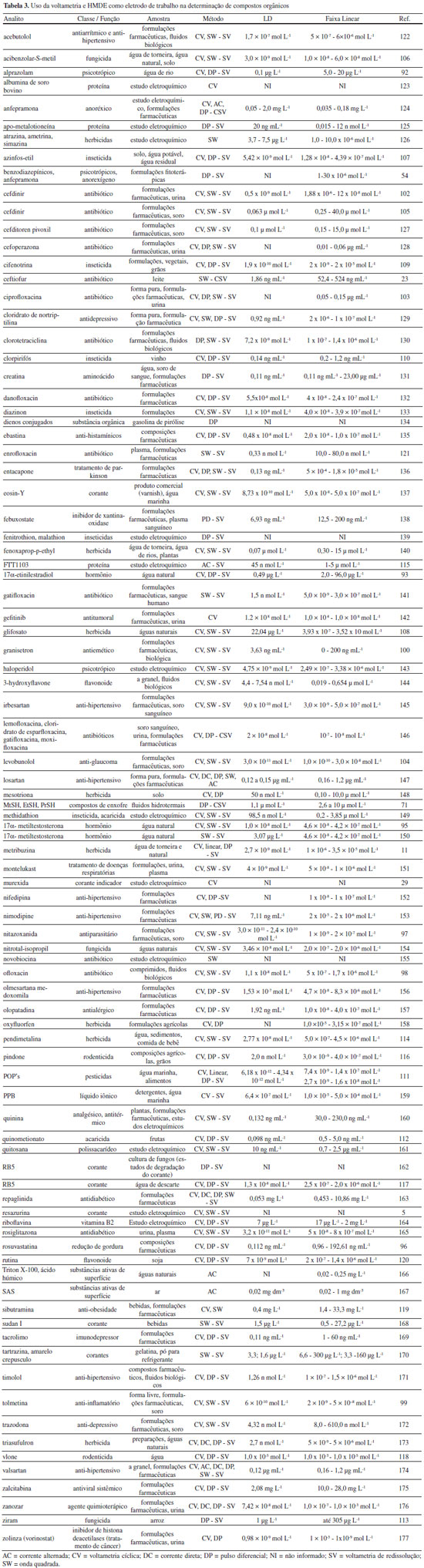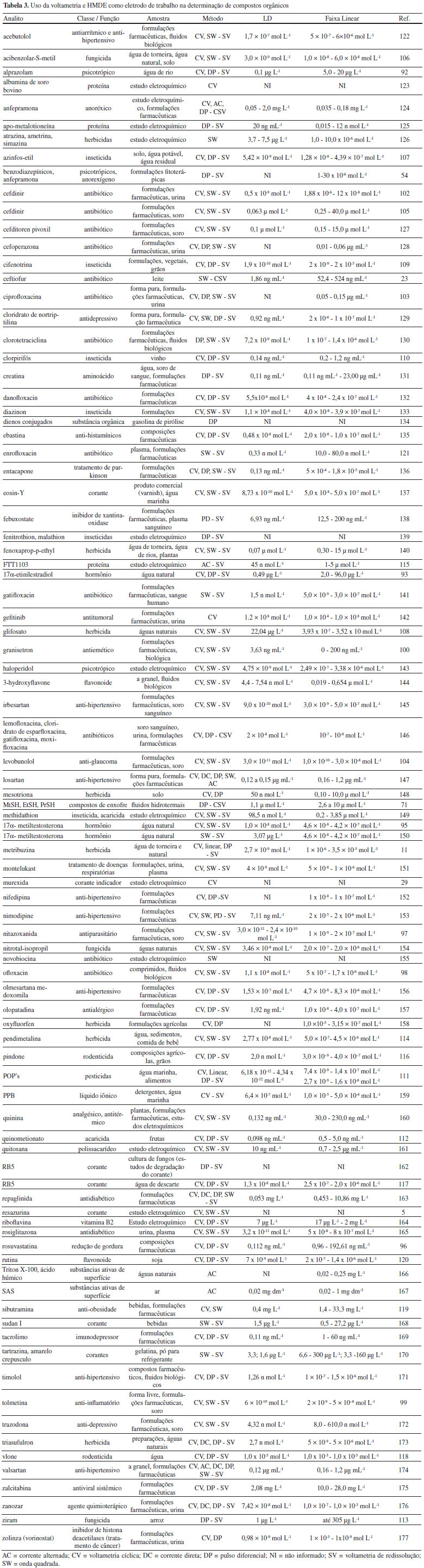 Na Tabela 3 nota-se a ampla aplicabilidade dos métodos voltamétricos na determinaçao de compostos orgânicos. Obviamente, as consideráveis vantagens supracitadas deste eletrodo, como o baixo custo operacional e de equipamento, simplicidade e versatilidade, foram decisivas para a escolha da técnica de análise por tantos pesquisadores.