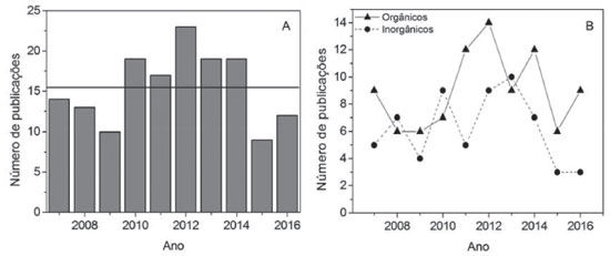 Figura 3. Gráficos relativos ao número de publicaçoes por ano empregando HMDE. (A) Publicaçoes totais. (B) Segregaçao entre publicaçoes com compostos orgânicos e inorgânicos
