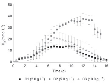 ![]() Figure 1. Hydrogen production (mmol L -1) in conditions: C1 (2.0 g cellulose L -1), C2 (5.0 g cellulose L -1) and C3 (10.0 g cellulose L -1)