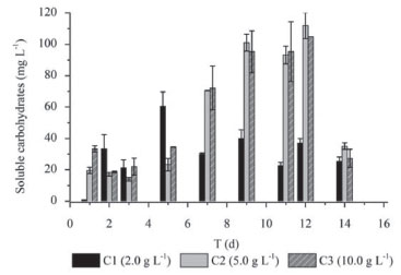 ![]() Figure 2. Temporal profiles of soluble carbohydrates in conditions: C1 (2.0 g cellulose L -1), C2 (5.0 g cellulose L -1) and C3 (10.0 g cellulose L -1)