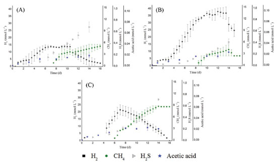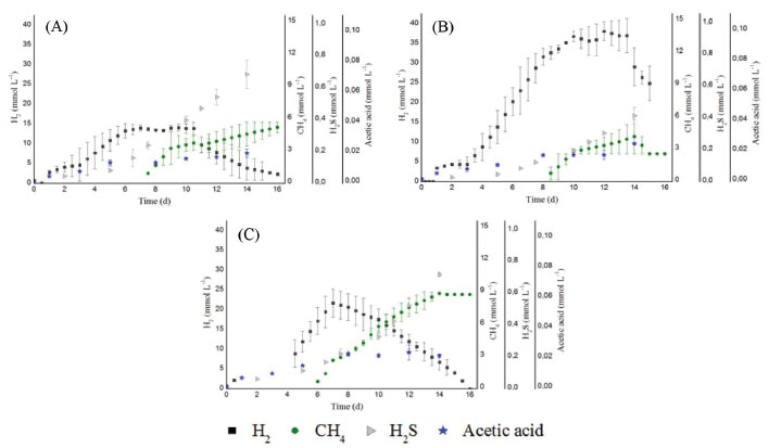 Figure 3. Temporal profiles of H2, CH4, H2S and Acetic acid concentrations for conditions: C1, 2.0 g cellulose L -1 (A); C2, 5.0 g cellulose L -1 (B) and C3, 10.0 g cellulose L -1 (C)