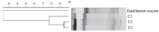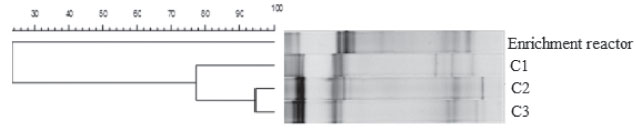 Figure 4. Dendrogram based on the Pearson coefficient of similarity of the DGGE profiles (enrichment reactor with glucose; C1: 2.0, C2: 5.0 and C3: 10.0 g L -1 of cellulose)
