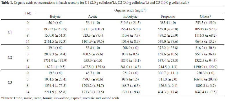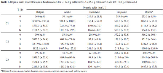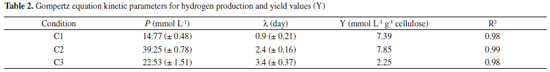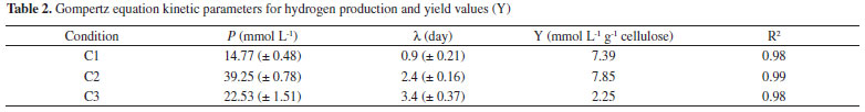 For all conditions, there was a predominance of butyric and acetic acid in relation to other organic acids, which totaled 60% of total acids composition. The presence of these acids in the fermentation of cellulosic material has been widely reported.8,9,32 In C2, which had the highest hydrogen production (39.25 mmol L -1), 1.8 g L -1 of butyric acid and 1.2 g L -1 of acetic acid were produced. The acetic and butyric acids in the three bioassays, 2.0 g L -1 of butyric acid and 1.0 g L -1 of acetic acid, were similar to those reported by Lay (2001)18 using 5.0 g L -1 of cellulose as substrate and a pre-treated mixed culture obtained from an anaerobic digester sludge as inoculum. The organic acids as a function of the operational period of the batch reactors for the three tested cellulose concentrations are described in the Table 1. The hydrogen production started at 0.9, 2.4 and 3.4 days (d) in C1, C2 and C3, respectively (Table 2). Li et al.33 observed the λ increasing (0.66 to 0.74 day) with increasing cellulosic substrate concentrations (20 to 40 g L -1), using seed sludge as inoculum for hydrogen production. Ratti et al.9 also reported the λ increasing according to the cellulosic concentration. These authors related increase of λ from 5.1 to 9.2 with 2.5 to 10.0 g L -1 cellulose, respectively, with ruminal fluid as inoculum and commercial cellulase application. This period (λ) corresponds to the time required for the enzymatic conversion of cellulose into soluble sugars and the catabolic conversion of these sugars into hydrogen, organic acids, and alcohols.3 Therefore, the difference in the λ probably occurred due to the period required for the adaptation of the microbial consortium to the increasing cellulose concentration.
