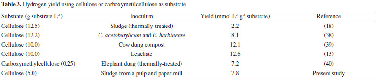It was also observed that the hydrogen yield increased with increasing cellulose concentration, 7.39 to 7.85 mmol L -1 g -1 cellulose (2.0 to 5.0 g L -1, respectively), but decreased when the cellulose concentration was 10.0 g L -1 (2.25 mmol L -1g -1 cellulose). The high concentration of substrate may negatively affect the hydrogen production, either by the high partial pressure,34 or by the excess of soluble sugars released that inhibit both cell growth and cellulase production, which may consequently endanger the end-product yields.6 The highest hydrogen yield (7.85 mmol L -1g -1 cellulose) was obtained in C2, indicating that this condition was favorable to the fermentative metabolism. The fermentation of cellulose by microbial consortium has been widely studied.3,9,35,36 The hydrogen yield values in our study are in agreement with the previous studies using cellulose as substrate (Table 3). Ratti et al.9 obtained higher hydrogen yield (12.6 mmol H2 g -1 cellulose) using 10.0 g L -1 of cellulose and leachate as inoculum. However these authors obtained the hydrolysis of cellulose only after the application of commercial cellulase.