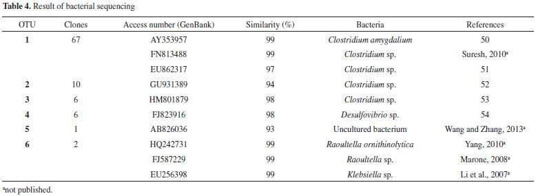 The bacterial diversity (Shannon index) was 2.11, 2.08, 2.18, and 2.01 for the enrichment reactor, C1, C2, and C3, respectively. In a similar fashion the bacterial richness (Chao-1 index) was 9, 9, 11, and 8 for the enrichment reactor, C1, C2, and C3, respectively. There was little variation among the samples, with values close to 2. For the samples of the enrichment reactor (with glucose), it can be inferred that the low diversity observed was a consequence of selective enrichment with the culture medium used, which favored the growth of fermentative bacteria. As for the conditions with cellulose, a greater diversity was verified in C2 (2.18) and a lower diversity in C3 (2.01). It is possible that the fermentative populations were also concentrated in C2, producing hydrogen, because it was the condition under which there was greater hydrogen production (39.25 mmol L -1). The Chao-1 method allows estimating the total number of species in a given community, it estimates the total richness, considering the rare species. Again, for condition C2, with higher hydrogen production, greater richness (11) was observed. Therefore, the highest hydrogen production (39.25 mmol L -1) was obtained in condition (C2) with high richness and diversity index (9.00 and 2.08, respectively). A possible explanation for this might be that several bacterial populations were related both to cellulose hydrolysis and to hydrogen production. In fact, in anaerobic systems the concomitant hydrolysis and fermentation of cellulolytic substrates is performed by a physiologically diverse populations of cellulolytic microorganisms and non-cellulolytic bacteria.12 Phylogenetic characterization The cloning and sequencing of bacterial populations resulted in 92 clones, which were arranged into six OTUs. The sequences presented high similarity to the sequences from Clostridium (OTU 1 and 3), Desulfovibrio (OTU 4), Raoultella (OTU 6) and Klebsiella (OTU 6) deposited in the NCBI database (Table 4).