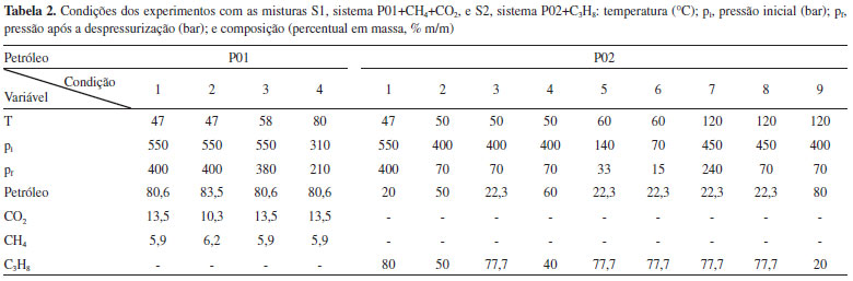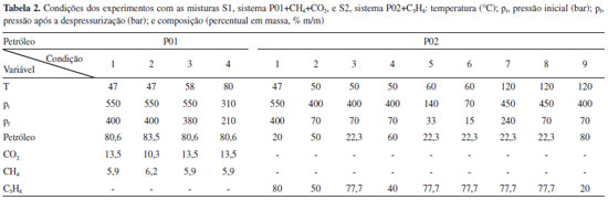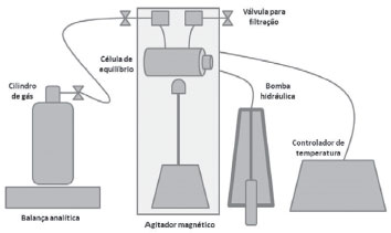 Uma barra magnética e uma quantidade conhecida de petróleo foram colocadas na célula de alta pressao, que foi conectada por meio de um tubo de PEEK a um cilindro de paintball contendo o gás desejado colocado sobre uma balança (Shimadzu, BL-3200H). Após a adiçao do gás, ou gases, o sistema de agitaçao foi ativado e a temperatura e pressao do equipamento foram ajustadas; estabelecido o equilíbrio temperatura/pressao, foi aguardado o tempo estipulado até à despressurizaçao e, após o equilíbrio nas novas condiçoes (mesma temperatura inicial e pressao inferior), foi aguardado 24 h e, entao, foi realizada a filtraçao.