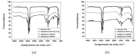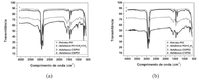 Figura 3. Espectros de absorbância na regiao do infravermelho: (a) petróleo P01 e asfaltenos C5I e C7I (norma IP143) e precipitado de um experimento com o sistema P01+CH4+CO2; e (b) petróleo P02 e asfaltenos C5I e C7I (norma IP143) e precipitado de um experimento com o sistema P02+C3H8