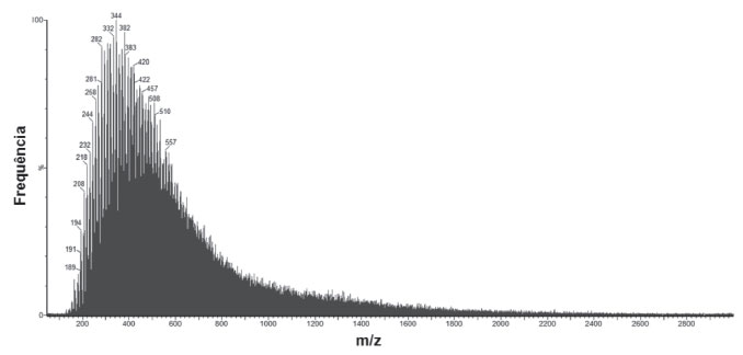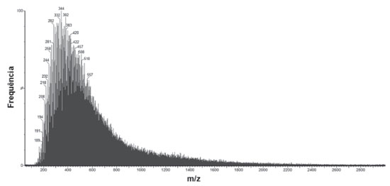 Figura 4. Espectro de massas dos asfaltenos C7I (insolúveis em n-heptano) do petróleo P01 obtidos por espectrometria de massas com ionizaçao por dessorçao a laser (LDI-MS)