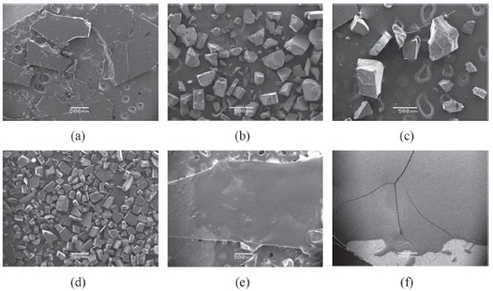 Figura 2. Imagens de microscopia eletrônica de varredura (MEV) dos asfaltenos (a) C5I/P01; (b); C5I/P02 (c); C7I/P01; (d) C7I/P02; (e) amostra do sistema S1na condiçao 1 (mistura P01+ CH4+CO2, 80,6% m/m de petróleo, à temperatura constante de 47 °C e filtraçao após despressurizaçao de 550 bar a 400 bar); (f) amostra do sistema S2 na condiçao 3 (mistura P02+C3H8, 22,3% m/m de petróleo, à temperatura constante de 50 °C e filtraçao após despressurizaçao de 400 bar a 70 bar) (condiçoes experimentais apresentadas na Tabela 2)