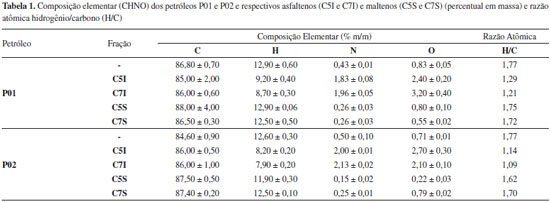 RESULTADOS E DISCUSSAO Asfaltenos C5I e C7I dos petróleos P01 e P02 e Início de Precipitaçao A partir do procedimento realizado pela norma IP143,27 foram obtidos teores de 1,74 ± 0,06% e 4,33 ± 0,01% de asfaltenos insolúveis em n-pentano (C5I) e 0,44 ± 0,00% e 2,45 ± 0,07% de asfaltenos insolúveis em n-heptano (C7I) para os petróleos P01 e P02, respectivamente. Ambas as fraçoes de asfaltenos estao presentes em maior percentual no petróleo P02, e os teores de asfaltenos C5I também sao maiores nos dois petróleos. Pesquisas indicam que n-alcanos com cadeias menores, nC < 7, induziriam a precipitaçao de maior quantidade de asfaltenos de menor massa molar.3,21 Baixos teores de asfaltenos insolúveis em n-heptano indicam que esses petróleos apresentam maior concentraçao da fraçao de baixa massa molar (insolúvel em n-pentano, neste caso) e, segundo alguns autores,3,20,28 sao mais susceptíveis a problemas de precipitaçao em campo. Dessa forma, o petróleo P02 estaria mais sujeito a tais problemas em relaçao ao P01. Na determinaçao do início de precipitaçao de asfaltenos C7I nos petróleos (IP) por espalhamento de laser (1550 nm), as adiçoes iniciais do n-heptano diluem a amostra e aumentam gradualmente a transmitância; a partir de certa concentraçao do n-alcano, há formaçao de agregados, que espalham a luz (laser); a partir deste ponto, enquanto ocorre a precipitaçao dos agregados formados, acréscimos subsequentes de n-heptano levam à formaçao de novos agregados e diluiçao da amostra, que reduzem o sinal de transmitância até um valor relativamente estável. O máximo do sinal da transmitância é o ponto de início da precipitaçao dos asfaltenos no petróleo, expresso como o volume de n-heptano por massa de petróleo (mL g -1).25 Neste trabalho, foram obtidos os valores de início de precipitaçao (IP, volume de n-heptano/massa de petróleo) de 2,65 ± 0,07 mL g -1 para o P01 e 1,30 ± 0,00 mL g -1 para o P02. Quanto menor o valor de IP, menor a quantidade de n-heptano necessária para induzir a precipitaçao, indicando que este petróleo está em uma condiçao mais sujeita a variaçoes no equilíbrio do sistema, confirmando a interpretaçao dada aos teores das fraçoes C5I e C7I desses petróleos. Composiçao elementar (CHNO) dos petróleos e fraçoes C5 e C7 de asfaltenos e maltenos Os resultados da análise elementar (CHNO) dos asfaltenos C5I e C7I dos petróleos P01 e P02 e respectivos maltenos (C5S e C7S) sao apresentados na Tabela 1, junto aos valores da razao atômica H/C, sendo que maltenos é a denominaçao dada à fraçao do petróleo após a extraçao dos asfaltenos, isto é, à fraçao do petróleo solúvel no n-alcano utilizado na extraçao.