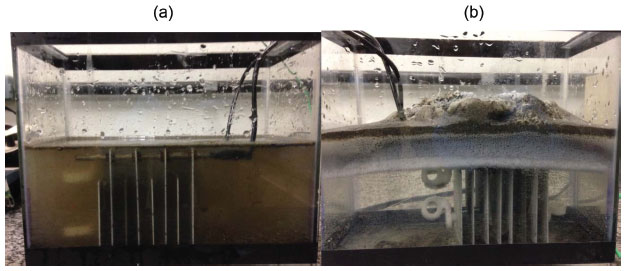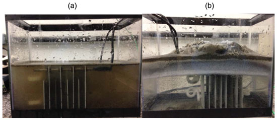Análises de cor e turbidez Os melhores resultados para análise da cor e turbidez foram observados com o potencial elétrico em torno de 15 V, distância entre as placas de 10 mm e corrente de 5 A, com geraçao expressiva de bolhas no sistema. É importante ressaltar que a corrente desempenha papel fundamental no tamanho e quantidade de bolhas de gás formadas no processo.23 Existe uma proporcionalidade entre a a corrente e a quantidade de bolhas.24 Em valores de potencial e distância entre as placas mais baixos nao se formaram bolhas suficiente para a flotaçao das partículas, e em potenciais mais elevados nao foi perceptível aumento expressivo na formaçao de bolhas, justificando, assim, o emprego do potencial de 15 V, corrente de 5 A e distância entre as placas de 10 mm. A Figura 2 mostra a diferença entre o efluente no instante de tempo zero (Figura 2a) e após 20 min de tratamento (Figura 2b). Com o tempo superior a 20 min, observou-se que nao havia mais alteraçao da cor da amostra.