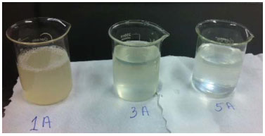 ![]() Figura 4. Amostra do efluente tratado com diferentes correntes, 1, 3 e 5 A