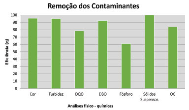 Os resultados obtidos demonstraram que o tratamento com o reator eletroquímico de ECF, nesta empresa, promoveu uma reduçao significativa em todos os parâmetros analisados, com remoçao média acima de 90% para DBO5; 95,6% e 94,9% para cor e turbidez, respectivamente. A grande reduçao no teor de matéria orgânica pode ser relacionada à oxidaçao das substâncias orgânicas dissolvidas, a qual se deve à presença das pequenas bolhas de oxigênio que atuam como um potente agente oxidante no meio.12 Isso de fato confirma o potencial da técnica empregada para o tratamento do efluente em questao.