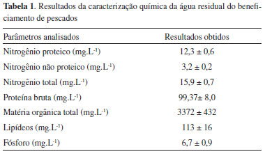 RESULTADOS E DISCUSSAO Caracterizaçao da água residual A caracterizaçao química da água residual bruta foi realizada através das análises de nitrogênio proteico, nitrogênio nao proteico, nitrogênio total, proteína bruta, matéria orgânica total, fósforo e lipídeos, conforme mostrado na Tabela 1.
