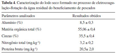 Com o intuito de verificar a eficácia do tratamento com corrente de 5 A, foram realizadas cinco repetiçoes com avaliaçao e caracterizaçao físico-química da água residual bruta e tratada. A Tabela 3 apresenta a média dos resultados, a eficiência de remoçao de cada parâmetro analisado e os valores estabelecidos pela legislaçao brasileira para efeitos de comparaçao. Conforme resultados apresentados na Tabela 3, a ECF tem a propriedade de aumentar o pH do meio, especialmente quando o meio apresenta característica levemente ácida, conforme foi explanado anteriormente. Os resultados das análises físico-químicas demonstraram uma reduçao significativa da cor, turbidez, DBO5, DQO, fósforo, sólidos suspensos e óleos e graxas, independentemente da coleta. Isso mostra que o tratamento eletroquímico via ECF é robusto e eficiente. De modo geral, todos os parâmetros analisados apresentaram uma eficiência média acima de 90% na remoçao dos contaminantes, sendo as maiores reduçoes observadas na remoçao da cor, turbidez e DBO5, com 95,5; 96,9 e 97,5%, respectivamente. Entretanto, o teor de alumínio na água tratada, decorrente do desgaste do eletrodo durante o processo de ECF, foi 5,5 mg L -1. É importante ressaltar que a legislaçao brasileira nao estabelece limites para alumínio em efluentes.32 Valores semelhantes também foram observados em outros trabalhos, utilizando a ECF na separaçao de poluentes das águas residuais de restaurantes,33 e no tratamento de águas residuais de lavagem.34 Os resultados também mostraram que uma das maiores vantagens da ECF é na remoçao de óleos e graxas, com remoçao média acima de 93%. Esse fato ocorre devido a uma melhor interaçao dessas moléculas com o hidróxido de alumínio, facilitando, assim, a coagulaçao e a flotaçao dessas moléculas através da formaçao de coloides cuja densidade é menor que a da água.35 Esses coloides deslocam-se naturalmente para a superfície da câmara de separaçao. No entanto, a flotaçao das partículas coloidais é mais rápida e eficiente por causa da formaçao das microbolhas geradas no processo.36 Essa peculiaridade da ECF pode ser aproveitada para utilizaçao no tratamento de efluentes contaminados com altas concentraçoes de óleos e graxas. Diversos trabalhos na literatura demonstraram a aplicaçao do processo de ECF no tratamento de águas residuais com elevados teores de óleos e graxas,29 no tratamento de águas residuais oleosas do moinho de azeite,37 na avaliaçao do efeito da natureza do eletrólito no tratamento de soluçoes óleosas por ECF38 e na remoçao de óleos e graxas de um reservatório de água residual.39 Além disso, o processo de ECF tem duas vantagens significativas, menor tempo de retençao e menor quantidade de lodo produzido quando comparado com os processos convencionais. Nestas condiçoes, a quantidade de lodo seco foi de 0,35-0,40 kg por m3 de água residual tratada. Este valor corresponde apenas 35 a 40% do lodo total produzido por processos convencionais de coagulaçao/flotaçao utilizando aditivos químicos. Entretanto, a concentraçao de alumínio residual no lodo seco foi de 8,5%, matéria orgânica 55,06%, cinzas 35,50% e proteína bruta 20,50 mg kg -1, como mostra a Tabela 4.