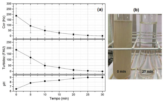 A cor para este tipo de efluente é, geralmente, um indicador da presença da matéria orgânica solúvel, oriunda da degradaçao de matéria de origem animal ou de animais microscópicos em suspensao na água.25 A cor, normalmente, é de tonalidade amarelada com elevados valores de turbidez, que, por sua vez, reduz a transparência devido à presença de matéria orgânica em suspensao.26,27 Grande parte dos microrganismos patogênicos sao dissolvidos na presença destas partículas e, por isso, a eliminaçao delas é fundamental em águas residuais. Após a definiçao das condiçoes do sistema, as amostras foram submetidas às análises cinéticas para avaliaçao dos parâmetros cor, turbidez e variaçao do pH. Para determinar a cinética de ECF para remoçao de cor e turbidez, alíquotas foram retiradas em intervalos de 5 min até completar 30 min, o que possibilitou a construçao da curva cinética e, consequentemente, a determinaçao do tempo de equilíbrio. O tempo de equilíbrio foi atingido quando os valores de cor e turbidez permaneceram constantes. Os resultados obtidos, tanto para cor quanto para turbidez, podem ser observados nas curvas da Figura 3. Observa-se que ocorre uma reduçao de cerca de 50% nos primeiros 5 min e que após 25 min de tratamento a água residual bruta ficou completamente clarificada (Figura 3b), apresentando valores próximos a zero para cor e turbidez, independentemente da amostra coletada. O alto desvio apresentado nos pontos iniciais da curva é devido à grande variabilidade da água residual tratada (5 amostras). Todavia, o sistema de tratamento de ECF demonstrou robustez, pois apesar da variabilidade inicial houve uma reduçao expressiva dos parâmetros estudados ao final do processo.