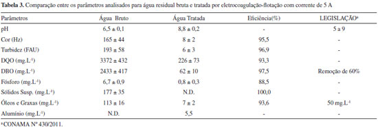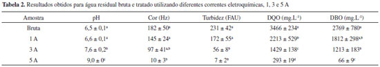Nos instantes finais do processo (25 a 30 min), a estabilizaçao no valor do pH pode estar associada à capacidade tamponante proveniente do tratamento eletroquímico, a qual está intimamente relacionada com o balanço entre a produçao e o consumo de OH -, prevenindo grandes oscilaçoes do pH do sistema.29 Esse efeito também foi verificado em outros trabalhos, tais como em estudos quantitativos comparando a dosagem química e a ECF em tratamento de águas residuais,30 em estudos da avaliaçao do desempenho do processo de eletrocoagulaçao na remoçao da dureza da água potável31 e em estudos do tratamento de soluçoes sintéticas simulando águas residuais de lavagem contaminada por fluidos de perfuraçao de poços de petróleo.14 Análises físico-químicas A avaliaçao da qualidade da água residual tratada por ECF foi realizada por meio de análises de pH, cor, turbidez, DQO e DBO5 em diferentes correntes. Todas as determinaçoes foram realizadas em triplicata. De acordo com resultados obtidos, com diferentes potenciais eletroquímicos, foi observado que nao ocorreu alteraçao significativa do pH para corrente de 1 A (Tabela 2) em comparaçao com o efluente bruto. A amostra para 1 A nao apresentou bom desempenho no processo, o que pode ser devido à baixa corrente, pois a hidrólise do alumínio depende do potencial aplicado.28 Aos resultados obtidos foi aplicado o teste de Tukey. Valores seguidos da mesma letra, na coluna, nao diferem estatisticamente entre si a 5% de probabilidade pelo teste de Tukey (Tabela 2). O teste de Tukey demonstra claramente que o aumento da corrente favoreceu o tratamento proposto. Resultados promissores foram obtidos com a corrente de 5 A, a qual reduziu significativamente, acima de 90%, quase todos os parâmetros avaliados (cor, turbidez, DQO e DBO5). Embora o pH tenha sido aumentado de maneira significativa (do ponto de vista estatístico), ainda se encontra dentro dos parâmetros legais de descarte (pH 5 a 9).32