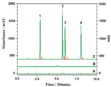 ![]() Figure 3. Chromatograms referring to (A) mobile phase, (B) placebo, and (C) standards solutions of (1) thiabendazole (TB), (2) febantel (FB), (3) toltrazuril (TZ) and (4) fluazuron (FZ)