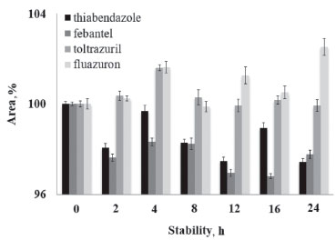![]() Figure 4. Stability of standard solution of thiabendazole (TB), febantel (FB), toltrazuril (TZ), and fluazuron (FZ)