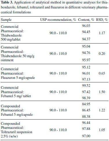 Robustness In order to carry out robustness tests, a study solution containing 0.250 µg mL-1 of each analyte was prepared in triplicate and analyzed under optimized and modified method conditions. Thus, the area values achieved under conditions of a proportion change in mobile phase B (acetonitrile) and flow rate change of the mobile phase were compared to those obtained in the optimized conditions. The robustness test showed that the reduction of mobile phase B percentage can compromise accuracy for FZ because the peak was not observed within the expected retention time. The modifications that were proposed for the flow rate did not change the retention time of all analytes. It is important to highlight that none of the changes or the obtained results invalidated the method, but they determined the precautions that must be taken during the analyses.42,43 Method application and pharmaceutical formulations Table 3 shows the results for the analysis of different commercial and compounded pharmaceutical formulations. The compounded pharmaceuticals were specially prepared by a local pharmacy. Compounded pharmaceuticals were specially prepared by a pharmacist and it was possible to conclude that, except for the compounded pharmaceutical febantel 5 mg/capsule samples, the pharmaceutical concentrations found are within the specified limit, which is between 90.0 and 110.0% for methods employing HPLC.39