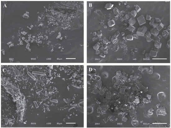 Figure 1. SEM images of the (A) thiabendazole (TB), (B) febantel (FB), (C) toltrazuril (TZ), and (D) fluazuron (FZ) at magnifications of 45× (B and D) and 300 × (A and C)