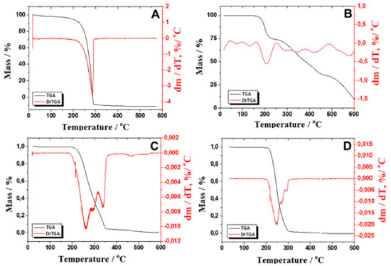 Figure 2. Thermogravimetric curves obtained for the (A) thiabendazole (TB), (B) febantel (FB), (C) toltrazuril (TZ), and (D) fluazuron (FZ)