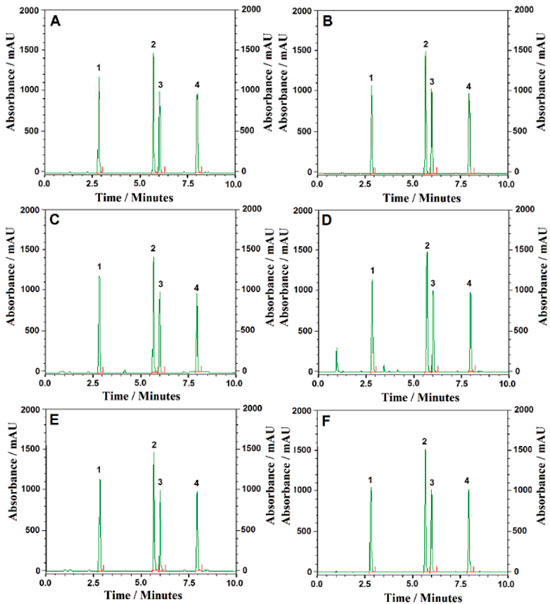 Figure 5. Chromatograms referring to selectivity test. (A) Neutral degradation; (B) acid degradation; (C) basic degradation; (D) oxidative degradation (peroxide); (E) heat degradation and (F) photobleaching. (1) thiabendazole (TB), (2) febantel (FB), (3) toltrazuril (TZ), and (4) fluazuron (FZ)