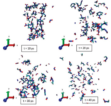 ![]() Figura 5. Evoluçao da decomposiçao térmica do cristal de HMX conforme avanço do tempo após estímulo da detonaçao