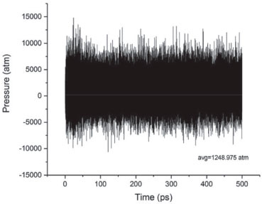 A presença de valores negativos de pressao indica constriçao instantânea do sistema, ou seja, ao longo do tempo, as diversas moléculas do sistema e vizinhanças (sistema periódico) se difundem pelo meio, trocando espécies e energia. A Figura 6 apresenta a evoluçao da pressao do sistema no volume de controle considerado o cristal de HMX (célula unitária). Durante este processo (em 50 ps) a pressao média do sistema atingiu um valor médio de 1248 atmosferas (124,8 MPa). Este valor é condizente com a realidade experimental, uma vez que foi considerada uma célula unitária contendo 375 átomos, submetida a um processo de rápida decomposiçao térmica (detonaçao). Com relaçao à energia do sistema, durante o tempo da simulaçao a variaçao observada foi de, aproximadamente, 818 kcal mol-1, ou 2.76 kcal g-1. Considerando o valor experimental de entalpia dos produtos de detonaçao do HMX (1.48 kcal g-1), infere-se que a modelagem molecular realizada apresenta proximidade significativa e, consequentemente, boa precisao quanto aos resultados obtidos. As mediçoes de pressao dos sensores, posicionados conforme descrito no item "ensaio experimental", sao apresentadas na Tabela 2.
