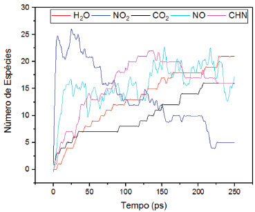 Conforme avanço do tempo, as ligaçoes internas das moléculas de HMX começam a se quebrar, formando diversos tipos de fragmentos e espécies intermediárias. A partir disso, os átomos começam a se reorganizar em novas espécies químicas, menores e mais estáveis, aproximando-se cada vez mais dos produtos principais da decomposiçao térmica do material (água e dióxido de carbono). Assim, observa-se que após 40 ps, há aumento da quantidade de espécies gasosas formadas (CO, CO2, CH2, CH, CH2O etc. ), assim como a dispersao destas espécies pelo volume de controle considerado, indicando também um aumento expressivo da pressao interna do sistema, conforme é possível observar na Figura 6. O tempo total da simulaçao dinâmica molecular reativa foi de 57 h 04 m 44 s. A quantificaçao das espécies geradas consta na Figura 7 e a entalpia envolvida no processo foi calculada pela diferença entre estado final e inicial da seguinte forma: ΔH = −35702,299 - (−33229,877) = −2472,422 kcal/mol.