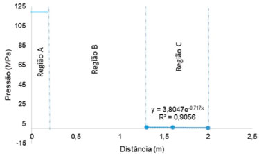 Esses dados permitiram a construçao de uma funçao que indicasse a taxa de decaimento da pressao entre as distancias de 1,3 a 2,0 metros, por meio de inserçao de linha de tendência exponencial, Regiao C da Figura 8. O coeficiente de determinaçao (R2) indica que o modelo explica 90,25% da variabilidade dos dados. 20 Entretanto, a funçao nao pode ser estendida para a Regiao B, pois a queda acentuada da pressao registrada no epicentro até a distância de 1,3 metros indica que ocorre um comportamento diferente. Esse comportamento pode ser explicado pela resistência oferecida pelo ar ao deslocamento da onda de choque. Na Regiao A consta a informaçao gerada pela simulaçao, anteriormente apresentada na Figura 6. Nota-se que a escala do eixo horizontal nessa regiao está deformada para permitir a visualiaçao da variaçao da pressao no eixo vertical. O valor 0 (zero) no eixo horizontal indica o epicentro da detonaçao.