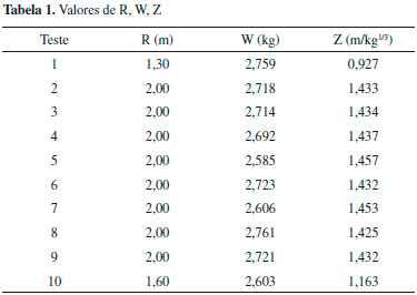 Os valores de pressao anotados foram relacionados ao valor simulado no epicentro para possibilitar a proposta de uma funçao matemática que indicasse a taxa de decaimento da pressao, partindo do epicentro até as distâncias onde foram anotadas para cada experimento (R). A Tabela 1 apresenta os valores de massa em equivalente TNT - Trinitrotolueno (W), distância real (R), distância em escala (Z). O equivalente em TNT é um método de quantificaçao da energia libertada em explosoes. A tonelada (ou ton) de TNT é uma unidade de energia igual a 4,184 giga joules, aproximadamente a quantidade de energia liberada pela detonaçao de uma tonaleda de TNT. A megatonelada (ou megaton) de TNT é uma unidade de energia equivalente a 4,184 petajoules.