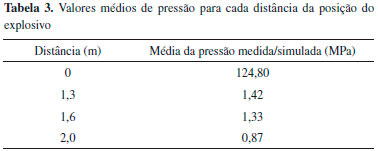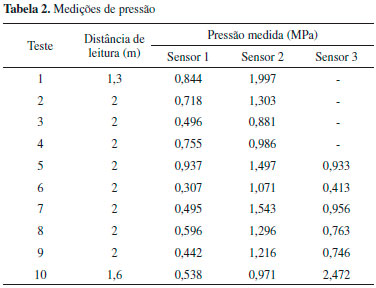 O trem explosivo foi montado numa cavidade na parte superior do cilindro, conforme visualizado na Figura 2. O explosivo foi disparado por uma espoleta elétrica comandada a uma distância de 250 m de um abrigo onde a equipe se protegeu durante os ensaios experimentais. Dois sensores de pressao piezoelétricos foram posicionados a 1,3 metros e três a 1,6 e 2,0 metros da posiçao do explosivo.