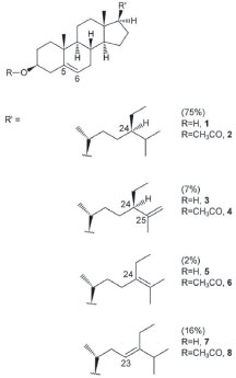 ![]() Figure 1. Sterols identified in Myxilla sp. (1,3,5,7) and their acetates (2,4,6,8)