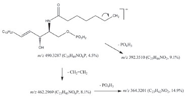 ![]() Figure 4. Fragmentation schema of the mixture of ceramide-1-phosphates isolated from Myxilla sp. observed in high-resolution mass spectrum